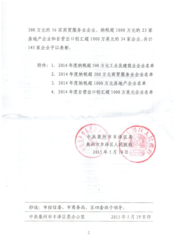 豐澤區委區政府以2015第22號文件形式決定對納稅超500萬的32家的工業企業、納稅超300萬的56家工貿企業、納稅超1000萬的23家地產企業、納稅超1000萬美元的34家出口企業進行集中表彰。