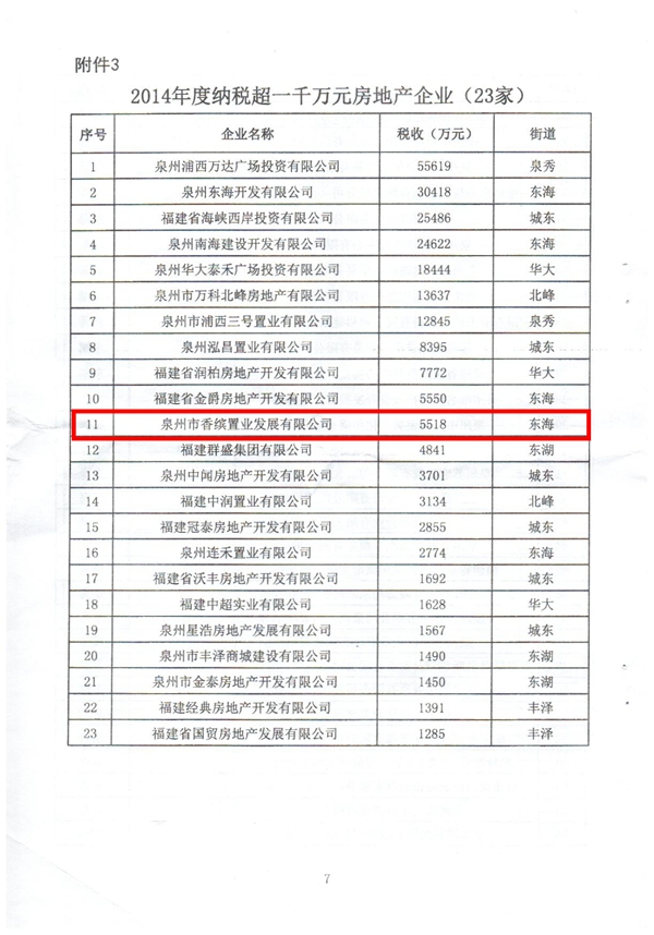 本網訊:近日,泉州市豐澤區人民政府下放第22號文件,對區域內“二次創業”和應對新常態,加強企業技術管理、創新和產業升級轉型取得突出成績的企業給予表彰。我集團旗下企業“泉州香繽置業”2014年納稅達5518萬元人民幣,榮獲政府重點表揚,并連續兩年成為泉州納稅大戶。